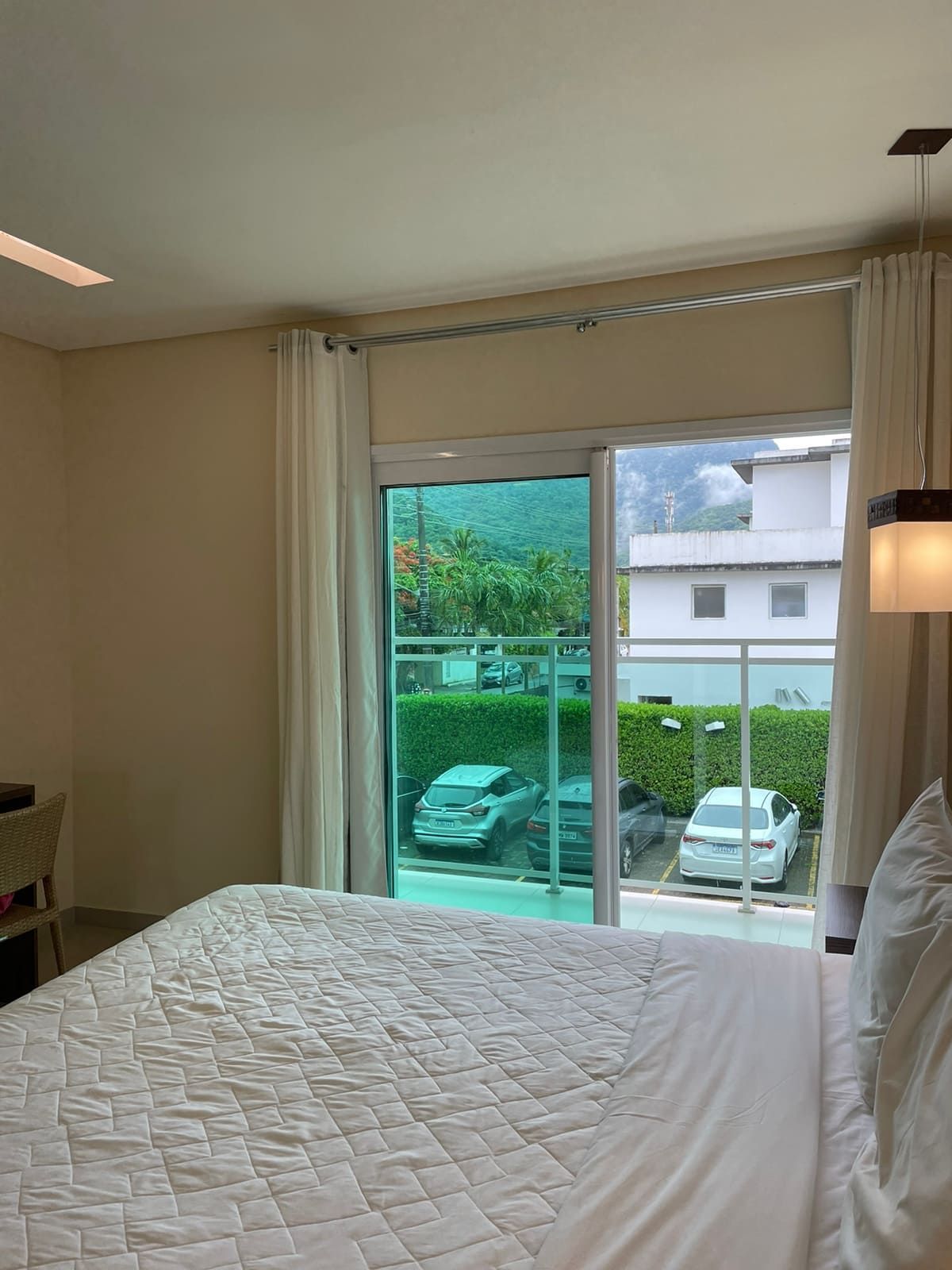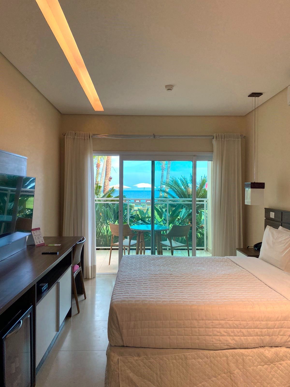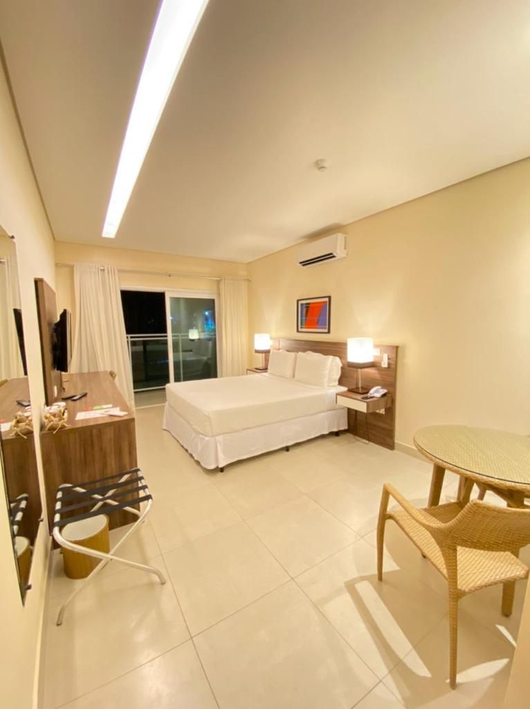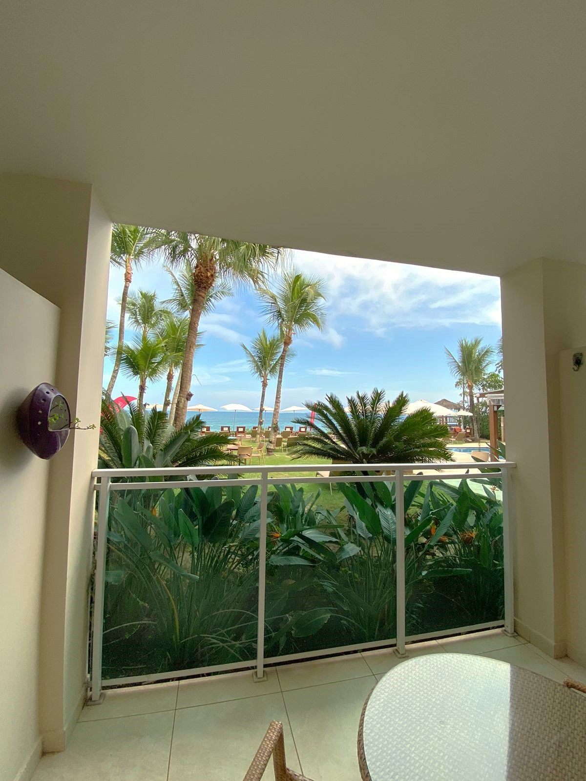 Quarto confortável e aconchegante com varanda voltada para o gramado e mar, a proximidade com o verde dos coqueiros faz desse quarto o refúgio ideal. A varanda dispõe de mesa e cadeiras para refeições apreciando a vista da praia ou até mesmo para hóspedes que precisam trabalhar durante a estadia, além disso, no quarto possui rede de descanso que pode ser facilmente instalada pelo hóspede na própria varanda.